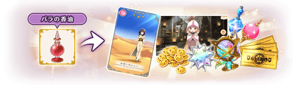 「ユリの香油」を消費すると本イベントのクエストをプレイでき、限定アイテムや覚醒素材と交換できる「バラの香油」を獲得できます。