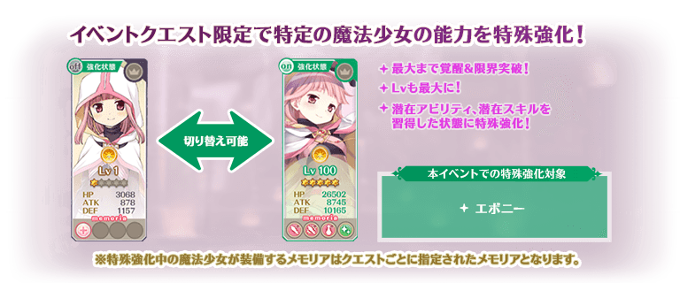 対象の魔法少女を編成して本イベントクエストをプレイする際に、ステータスを特殊な状態に強化することができます。