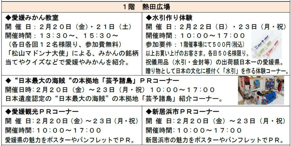 また、愛媛県産の柑橘を食べ比べる試食会や日本の文化に根付く「水引」を作る体験会、愛媛県 愛顔(えがお)PR特命副知事「みきゃん」のグリーティング、「松山マドンナ大使」がクイズなどで愛媛やみかんを紹介する「愛媛みかん教室」などを実施し、食・文化・観光と様々な愛媛の魅力をお客さまにお届けします。※2