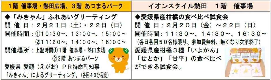 イオンリテール中部カンパニーは、愛媛県と共催し、2月20日(金)~24日(火)の5日間、イオンモール熱田(名古屋市熱田区)にて、愛媛の魅力をまるっとお届けする「愛媛県フェア」(以下、当フェア)を開催します。