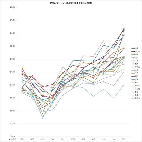 ■各区での町名別マンション坪単価 2011-2021変遷