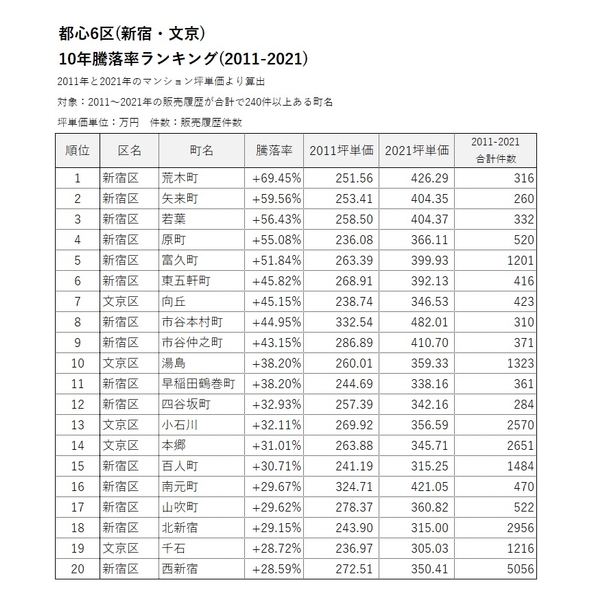※10年騰落率に関しては、都心6区内に小規模な町名が多数あることを考慮し、「2011~2021年の販売履歴が240件未満」の町名でのランキングも算出し、参考データとしてデータ集に記載。