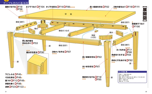 木工テープルを作成するための展開図をはじめ、組み立て手順だけでなく、木材の下ごしらえや墨つけ作業、面取り作業など、細かい作業についても詳細に紹介。