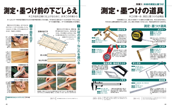 木工に欠かせない寸法の測定と、寸法を各パーツに書き入れる墨つけ作業。そのために必要な道具や正しい使い方を紹介。その後の切断、加工、接合といった完成までのプロセスを写真入りで解説します。