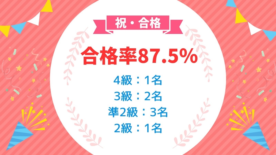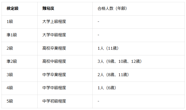 各級、6歳で中学中級レベルの4級や11歳で高校卒業レベルの2級にチャレンジして、みごとに合格を獲得しました!