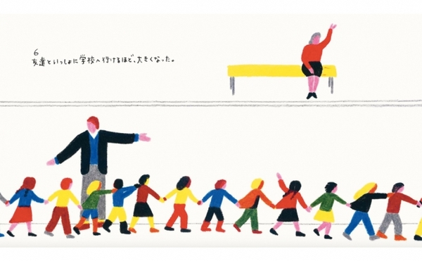 1ページごとに1歳ずつ年を重ねていくユニークな構成で、人の一生が1冊に収められています。さまざまなことができるようになり、世界の広さを学ぶ幼少年期、家族が増え、本当に大切なものや幸せとは何かを学ぶ中年期、別れの喪失と時間の儚さ、そして尊さを学ぶ老年期、どの世代にも、そのときどきで大切な学びがあるということを、心に響く言葉と色彩豊かなイラストで描かれています。