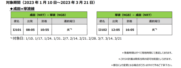スプリング・ジャパン 2022年冬ダイヤ 成田=寧波線 販売開始について