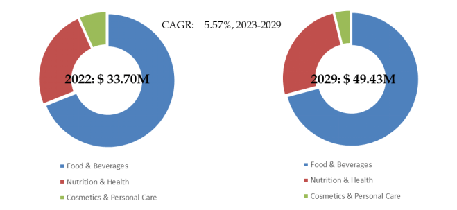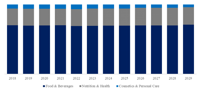 製品の用途別では、食品・飲料が最大の用途で、70.24%のシェアを占めている