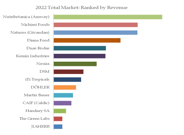 2022年には、世界の天然アセロラチェリーエキスの上位5社が売上高で市場シェアの53.19%を占める。上図は、天然アセロラチェリーエキスの売上高でランク付けされた主要プレーヤーを示している。
