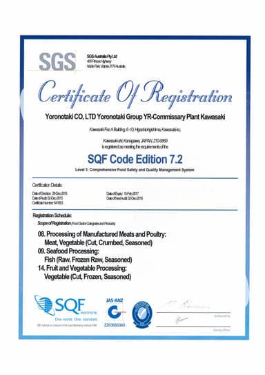 養老乃瀧グループで扱う多様なメニューで使用する食品の数は数百に及びます。メニューで使用する食品については、以前より当社の食品安全プログラムに適合したものを採用しておりましたが、自社食品加工センターにおいては第三者認証による妥協のない安全性と品質を追求するため、SQF認証を目指してセンター開設当初より取り組みを行って参りました。最近の食に纏わる問題、特にフードセーフティ(食品安全)とフードディフェンス(食品防御)の観点から、このSQF認証のプログラムを自社食品加工センターのオペレーションに落とし込み、機能させることで、高品位、高水準なメニューをお客様に提供できると考えております。