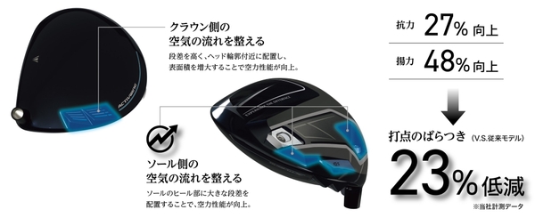 クラウン側の凸部に加え、新たにソール側にも大きな段差を設けた「New ActivWing」により、ヘッドの空力性能がさらに進化。空力がダウンスイング前半の「遠心力」によるヘッドのブレを抑制し、高確率で芯を捉える安定したインパクトをサポートします。