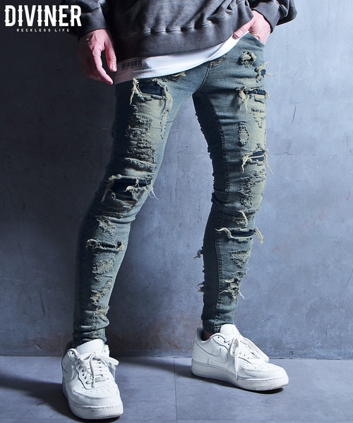 細身のスキニーデニムパンツに、荒々しいストリートを彷彿とさせるハードなダメージ加工を施したデザイン。伸縮性のある生地を採用しているため、ダメージパンツでありながらも穿き心地は抜群です。
