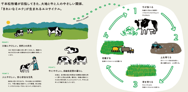 ①自然と100年以上共生し続ける中、自社畑の牧草・コーンにより乳牛を育て、牧場内の牧草を食べた牛の排泄物はたい肥原料の一部とし、再び土づくり、牧草づくりへと循環させる「持続可能な循環型酪農」に取り組み、環境負荷削減、食の安全、社会的価値の創造に対しひとつの回答を示すことを目標としています。