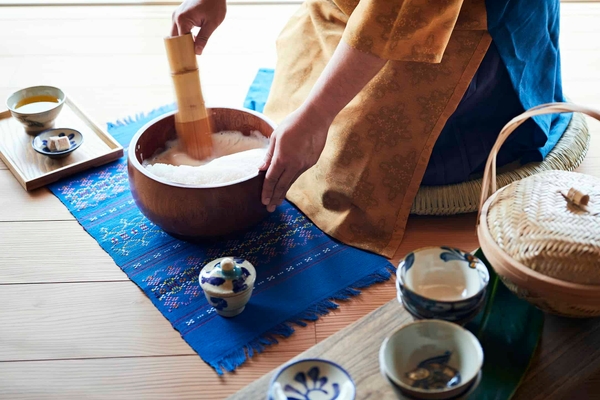 道場では、沖縄発祥の空手の他、三線や琉球舞踊など沖縄文化の体験ができるプログラムを行っています。また、古くから沖縄で親しまれていた「ぶくぶく茶」をはじめとする振る舞いを提供しており、道場は、時に身体を動かし、時にお茶を楽しむ、沖縄文化体験の拠点となる場所です。また、施設内に道場がある特徴を活かし、星のや沖縄では、リゾートに滞在しながら本格的な唐手の稽古に没頭できる「琉球唐手滞在」を提供しています。護身術や自己鍛錬の手段とされてきた「唐手」の稽古を通して、自分自身と向き合い、自分を磨くことを目指す滞在は心身共にリフレッシュできます。