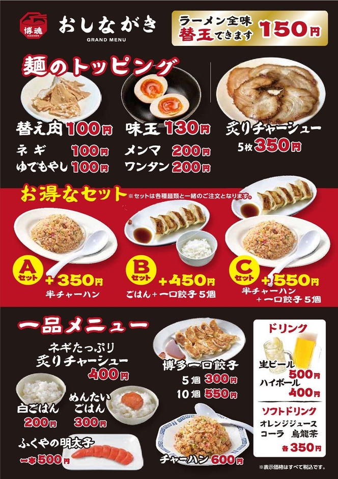 「豚骨ラーメン」「明太醤豚骨ラーメン」「醤油ラーメン」「塩ラーメン」の4種類をご提供。