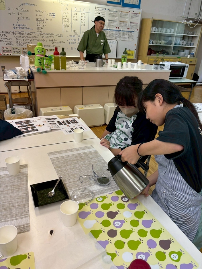 当日はわらび粉から生地を練り上げて形を整える工程に挑戦し、参加した子どもたちは想像以上に力が必要な作業に「大変だけど楽しい!」と笑顔を見せながら一生懸命取り組む姿が印象的でした。伊藤園による日本茶講座では、急須を使ったお茶の入れ方や茶葉の産地、香りの違いを学びました。