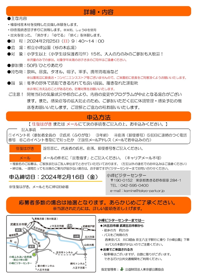 小峰公園で2月25日(日)に開催する「里山暮らし体験プログラム」。今回の内容は、炭を熾して、昔ながらの熱エネルギーを使ってみる「炭使い体験」です。