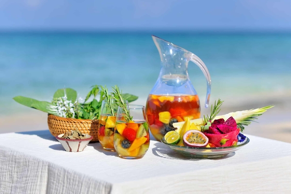 沖縄で古くから伝わる伝統ハーブを取り入れた紅茶に、フルーツで甘さと爽やかさを加えたフルーツブレンドティーを用意します。古くから沖縄には自生する薬草が多くあり、心身のリフレッシュや不調改善のためにお茶を飲む風習がありました。お茶を飲みやすくするためにパイナップルやシークヮーサーを加え、伝統ハーブとフルーツが爽やかに香る冷たいフルーツブレンドティーに仕上げました。他、モクテルやコーヒーもスイーツに合わせて楽しめます。