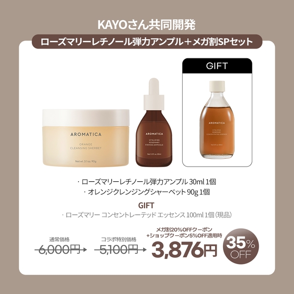 これを記念し、お得なコラボセットの販売が決定いたしました。コラボセットには共同開発した「ローズマリーレチノール弾力アンプル」とアロマティカのベストアイテム「オレンジクレンジングシャーベット」を通常価格より35%オフした価格でご購入できるほか、肌のキメにアプローチする「ローズマリーコンセントレーディッドエッセンス」を現品でプレゼントいたします。