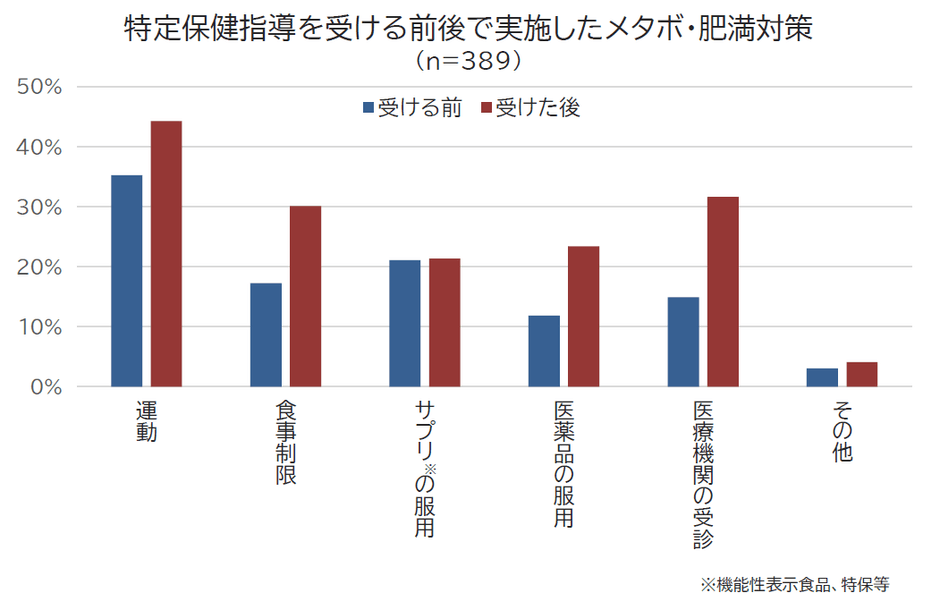 また、特定保健指導を受ける前と後で実施したメタボ・肥満対策を調査すると、特定保健指導を受けた後は何らかのメタボ・肥満対策を実施した方が多いことがわかりました。このことから、特定保健指導を受け、自分の健康に向き合った結果、意識が変わったことがよみとれます。