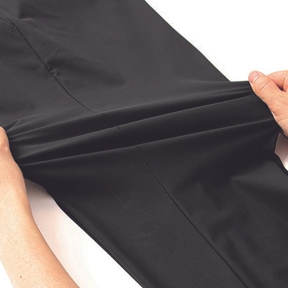 今回発売する『ゼロプレッシャースーツ』には、水着などのスポーツウェアにも使用される機能性ファブリックを採用しました。この生地は、旭化成株式会社のストレッチ繊維「ROICA®(ロイカ)」を使用したニット生地で、縦・横の両方向への高い伸縮性が特徴。一般的なスーツと比べて縦・横ともに6倍(当社比)のストレッチ性を誇るなど、抜群の動作性を体感できます。また、着用時の圧迫感(着圧)が極めて少ない他、今回のスーツは裏地・芯地・肩パッドなどの付属を可能な限り省くことで、これまでにない“解放的”な着用感を実現しています。
