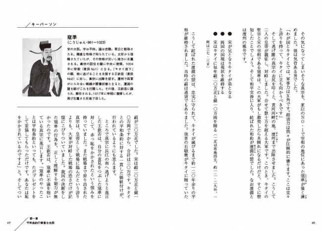 たとえば、宋の三代真宗の時代の家臣のNO.1で宰相の地位にあった寇準(こうじゅん)と、強力な軍事力でモンゴル高原を支配していたキタイが結んだ和約、「澶淵の盟(せんえんのめい)」。
