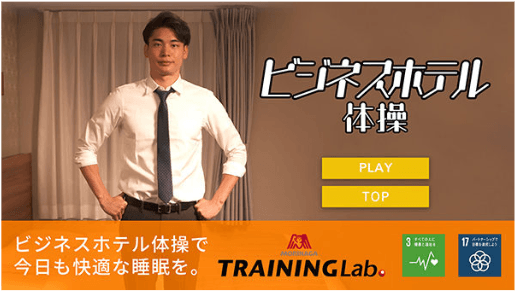 出張続きでホテル宿泊が多く、疲労がたまっている国内のビジネスパーソンに向けてホテルの客室や自宅等で手軽に実践できるホテル体操を森永製菓トレーニングラボ監修のもと、考案しました。限られた空間でも手軽に実践できる約3分のプログラムを配信しています。動画リンク https://youtu.be/SpfSyQ50N6o