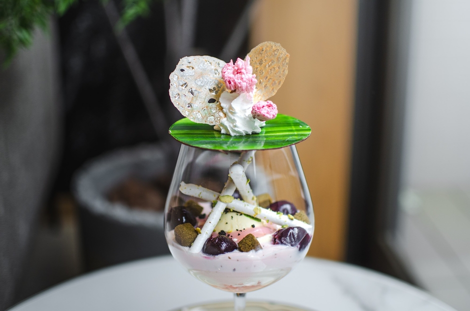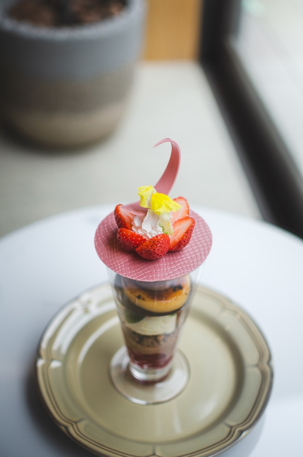 トップには、桜の花とピスタチオ付メレンゲ、そして緑のディスクチョコレート。中には、抹茶のシュトロイゼル、ダークチェリー、バニラアイスクリーム、桜あんクリーム、桜のパンナコッタ、杏仁豆腐など、様々な素材が重なり合い、口の中で豊かなハーモニーを奏でます。桜の優しい香りと、ピスタチオの濃厚なコク、そしてあんこの上品な甘さが絶妙にマッチ。見た目も華やかなパフェは、春のティータイムや、お祝いの席にもぴったり。五感で春を感じられる、贅沢なパフェをぜひお楽しみください。