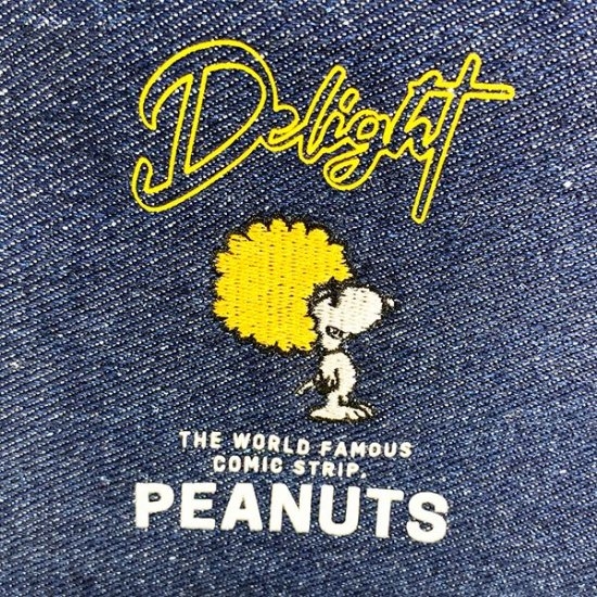 こちらがその、ランチトートバッグです。濃いめのデニム素材にファスナー部分のイエローがアクセントになっています。中央には、人気のアフロスタイルのスヌーピーの刺繍がデザインされています。