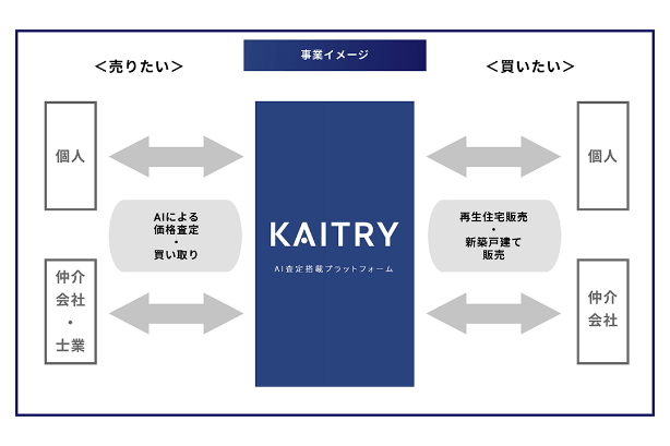 iBuyerとは、AIの価格査定アルゴリズムを活用して不動産を査定し、不動産会社または不動産ポータルサイトが売り手から直接物件を買い取る不動産売却のビジネスモデルで、物件の取引を極力オンライン上で遂行する仕組みです。「KAITRY」経由でエンド顧客の幅広いニーズに直接応えていくことで新たな市場、「誰もが」「いつでも」「何度でも」「気軽に」住み替えることができる未来を創造していきます。