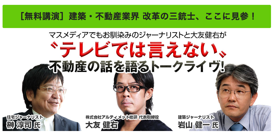 2016年2月3日 10:00株式会社アルティメット総研(所在地:東京都新宿区、代表取締役:大友 健右)は、住宅ジャーナリスト 榊 淳司氏、建築ジャーナリスト 岩山 健一氏、当社代表 大友 健右による無料講演『~建築・不動産業界 改革の三銃士、ここに見参!~テレビでは言えない不動産の話題を語るトークライヴ!』を2016年2月27日(土)に東京国際フォーラムにて開催いたします。