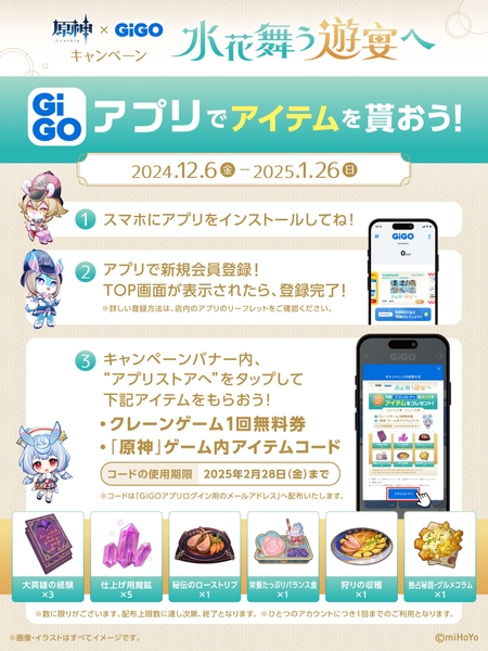 GiGOアプリをダウンロードして、キャンペーンに参加すると「原神ゲーム内アイテム配布コード」と「クレーンゲーム1回無料券」を進呈いたします。