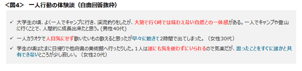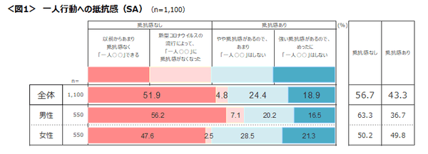 新型コロナウイルスの影響もあり複数人での行動がしにくい中で、一人行動についての抵抗感や、一人でもできること、一人行動の良い点・悪い点について聴取しました。