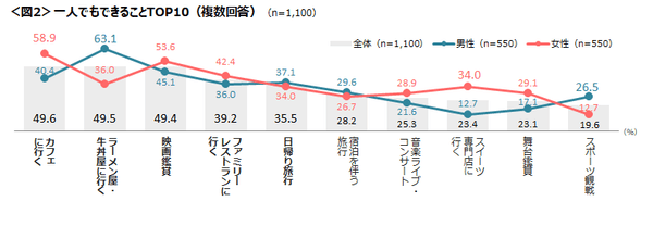 一人でもできることとしては、「カフェ」「ラーメン屋・牛丼屋」「ファミレス」などの飲食店に行くことや、「映画鑑賞」「日帰り旅行」が上位に挙がる。