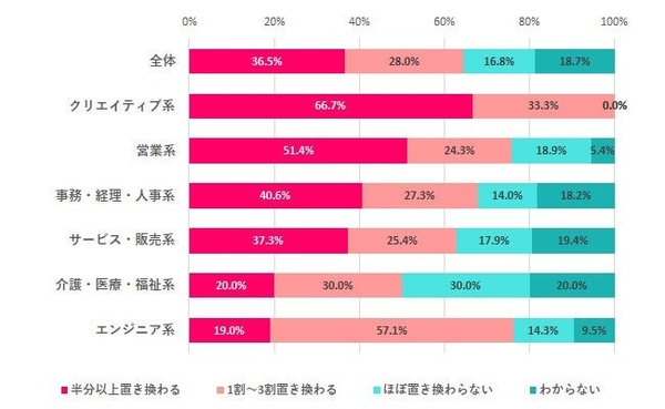 職種別で比較すると、クリエイティブ系は「半分以上置き換わる」66.7%、「1~3割置き換わる」33.3%で、「ほぼ置き換わらない」と回答した人がいませんでした。エンジニア系は「半分以上置き換わる」19.0%ですが、「1割~3割置き換わる」57.1%が多く、AIによる置き換えが進みにくい業務が大半と考える人が多いことがわかりました。