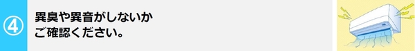 フィルターや熱交換器の汚れが過多となっている場合、嫌なニオイの原因になることがあります。また、振動が原因で異音に至るケースもあります。ぜひチェックをお願いします。