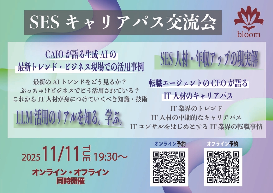 bloom株式会社は、11月11日(火)に【SESキャリアパス交流会】を九段下、神保町にあるシェアオフィスBuD squareのラウンジで開催いたします。