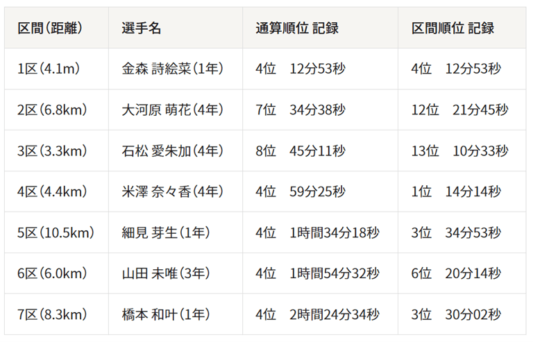 区間賞は大東文化大学のワンジル選手が獲得し、東北福祉大学の佐々木菜月選手(3年)が日本選手トップ。細見選手はそれに次ぐ区間3位(34分53秒)と大健闘した。首位の大東文化大学との差は1分39秒。前の中継所と同じ3校を追う恰好で4位でのタスキリレーとなった。