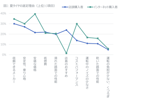 夏タイヤ購入者の20%がインターネットで購入した。商品の選定理由は「安価な価格」が最も多く39%で、「コストパフォーマンス」を挙げた人も30%存在した。また「安定性、乗り心地」「運転中のノイズの少なさ」等の性能面への関心が店頭購入者よりも高かった。参考にした情報源は「価格比較サイト/ショッピングサイト(37%)」「検索サイト(31%)」とインターネット上の情報が主であり、「YouTube動画/広告」を参考にしたとの回答も6%であった。なお購入検討に際し39%が店頭を訪れており、実際の商品を事前に確認する消費者も少なくない。購入先のウェブサイトを選んだ理由は、「タイヤの価格が安かったから」が最多で74%、前回の調査から4%ポイント上昇した。また「取付場所を指定できたから」も前回より3%ポイント上昇し11%に達した。