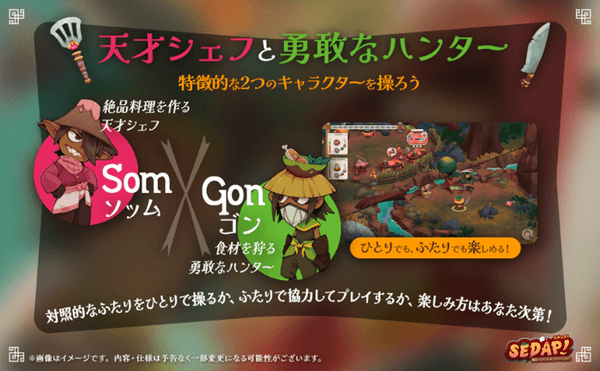 狩りを行う“戦闘担当”と、注文された料理をつくる“調理担当”のキャラクターをそれぞれ操作し、協力して料理の完成を目指す「2人プレイ」に加え、2人のキャラクターを同時に操る「1人プレイ」にも対応しています。