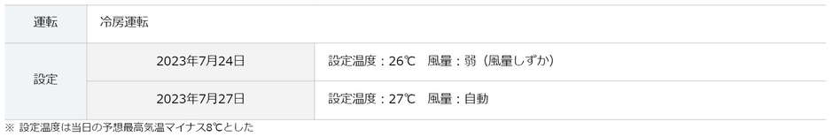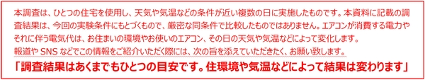 本調査は、1つの住宅を使用し、天気や気温などの条件が近い複数の日に実施したものです。そのため、厳密な同条件での比較ではありません。調査結果はあくまで今回の条件に基づくものであり、住宅やエアコン、気候によって結果は変わります。