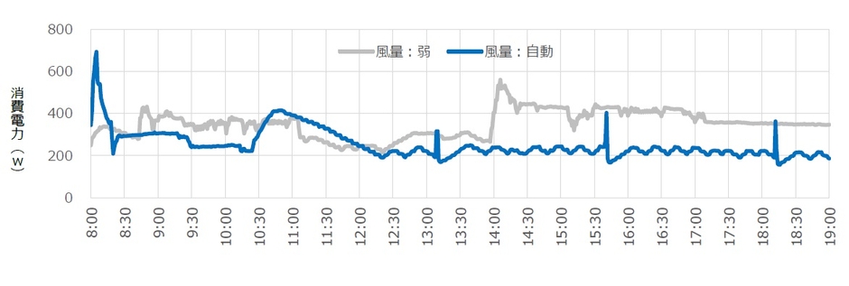 吹出口からの気流が弱い風量「弱」の方が節電につながりそうに思えますが、今回の実験では、風量「自動」の方が節電につながる結果となりました。