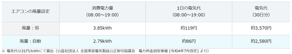 エアコン冷房の風量「弱」と風量「自動」の消費電力量を比較した結果、風量「弱」が3.85kWh、「自動」が2.79kWhとなり、風量「自動」の方が消費電力量が約3割少ないという結果になりました。1か月換算では、風量「自動」は「水平」と比べて電気代が約990円の差になります。