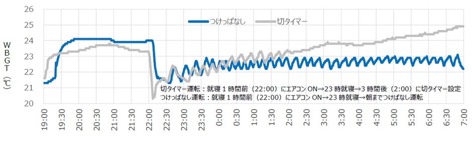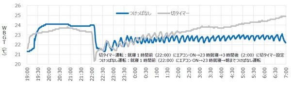 【検証5】夏の睡眠時のエアコンは、「切タイマー運転」と「つけっぱなし運転」暑さ指数「WBGT」の観点からどちらがおすすめ?⇒朝まで「つけっぱなし運転」の方が快適