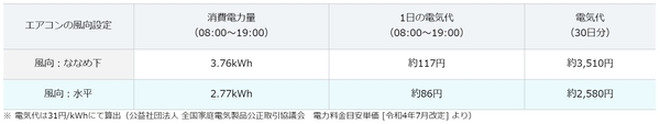 エアコンの冷房運転時の風向「ななめ下」と「水平」の消費電力量を比較した結果、「ななめ下」が3.76kWh、「水平」が2.77kWhとなり、風向「水平」の方が消費電力量が約3割少ないという結果になりました。1か月換算では風向「水平」は「ななめ下」と比べて電気代が約930円の差になります。