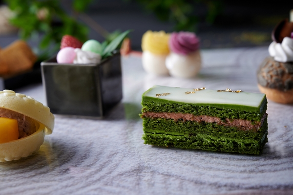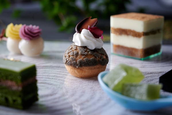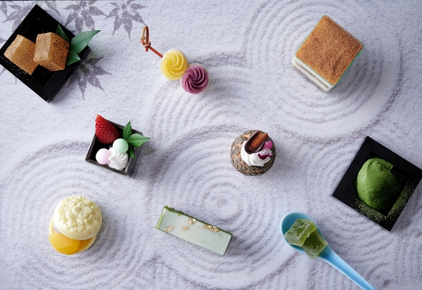 香り豊かな抹茶を使用した「とろける抹茶ムース」や「抹茶とライムのオペラ」、「抹茶カラーの琥珀糖」をはじめ、ジャスミンの華やかな香りがふわっと広がる「ジャスミン茶香るわらび餅」、香ばしい香りがスイーツとの相性抜群の「ほうじ茶のティラミス」、深みのあるウーロン茶とフルーツをあわせた「フルーツウーロンゼリー」など、お茶と和洋スイーツが織りなすハーモニーをご堪能いただけます。またセイボリーには「秋サーモンとアボカドのロール寿司 柚子風味」や「カラスミ色紙豆腐と大根のプチサラダ」など、秋の味覚を取り入れた和テイストのお食事をご用意いたしました。