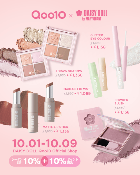 2025年10月1日 18:002025年10月9日(木)23:59まで、韓国発のオンラインショッピングモール「Qoo10(キューテン)」で開催中のメガポセールでデイジードールの気になるアイテムをゲット!“クーポン10%OFF+ポイント10%還元”で、実質20%OFFに。メガポマークが目印✨このお得なチャンスをお見逃しなく!