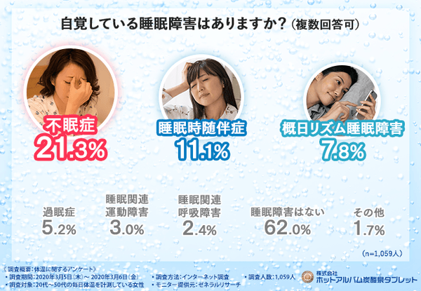 そこで、「自覚している睡眠障害はありますか?(複数回答可)」と質問したところ、2割以上の方が『不眠症(21.3%)』と回答しました。