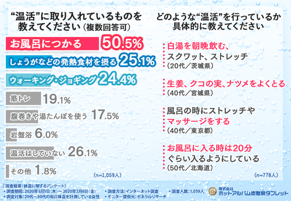 『お風呂につかる(50.5%)』という回答が最も多く、次いで『しょうがなどの発熱食材を摂る(25.1%)』『ウォーキング・ジョギング(24.4%)』『筋トレ(19.1%)』『腹巻きや湯たんぽを使う(17.5%)』『岩盤浴(6.0%)』と続きました。