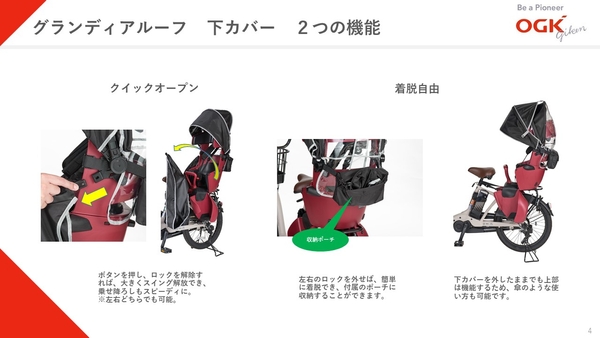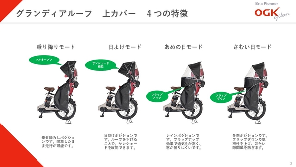 自転車用チャイルドシート国内シェアトップのオージーケー技研株式会社(本社:大阪府東大阪市、代表取締役:木村 泰治)は、自転車用チャイルドシートの最上位ブランド「グランディア」専用のリヤシート用レインカバー「グランディアルーフ(RCR-010)」を、3月12日よりオンラインストア(https://ogk-giken.shop-pro.jp)及び自転車販売店などで順次販売を開始します。上カバーは天気や気分に合わせて4つのモードを選べる“アレンジルーフ”を採用し、ファスナーなしで開閉できる下カバーで子どもの乗せ降ろしもラクにします(特許出願中)。パパママから寄せられたニーズに応え、憂鬱に感じる雨の日や慌ただしい毎日の自転車移動をサポートします。